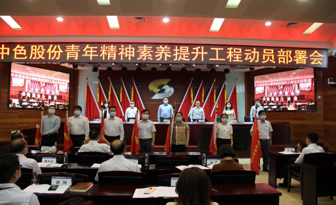 图丨中色股份公司隆重召开成年党员精神抖擞综合素质增强施工鼓励安排会,为7支成年党员冲刺队授旗,统筹推进成年党员位置建功